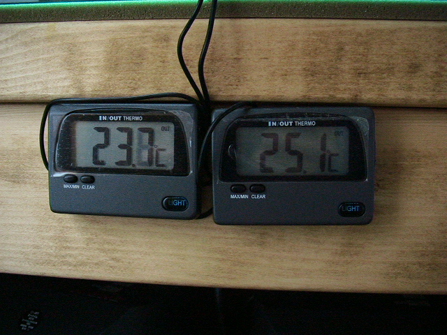 ↓は今年立ち上げた新水槽の温度計ですが、左、ファンON 右 ファンOFFで1時間後の水温です!すでに1.4℃違います。