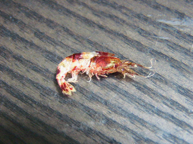 今日、仕事から帰ってきて水槽を覗いてきたら、何か白い物にえびが2,3匹群がっていました。えびの抜け殻でしたが、良く見ると、何か赤い物がプツプツと・・・・