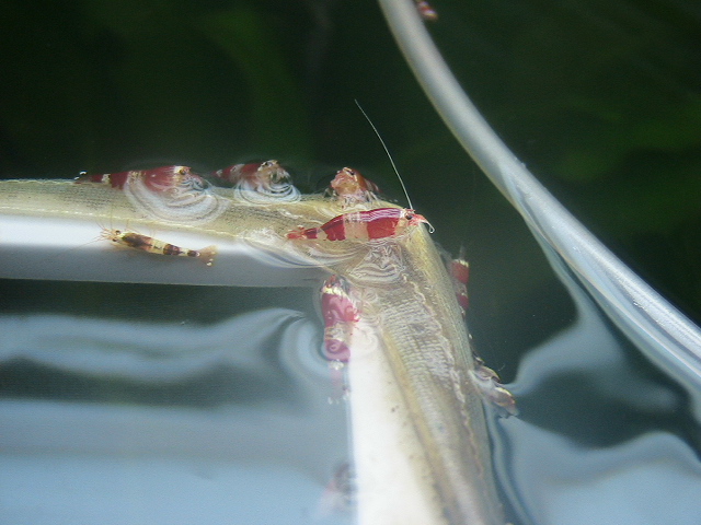 家に帰って早速、水槽に水を入れて見ると今まで水位が低くて行けなかった所にえび達が集まってツマツマしています。