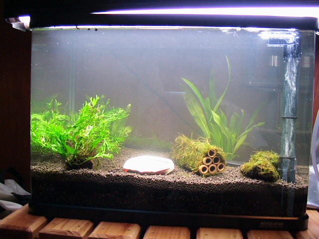 余っていた水草、流木と、どの水槽にも入れている自分で海で捕ってきたアワビの殻と前回のエントリーで巻いたシュリンプハウスを適当にセットし水を入れてみる。