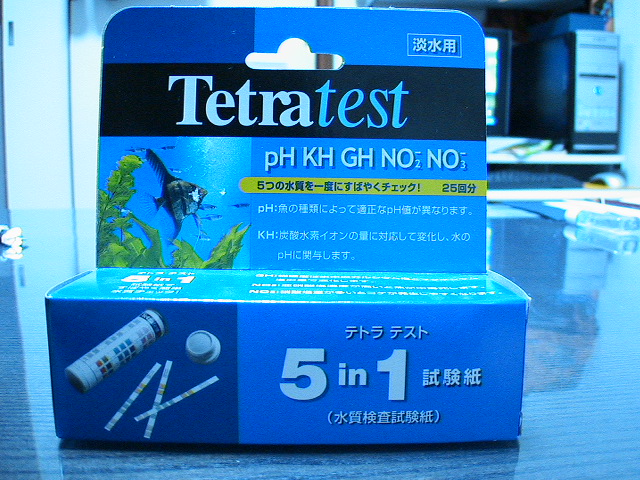 我家のえび水槽の水質を調べるために水質検査試験紙なるのもを買ってきた!PH,KH,GH,NO2,NO3の五種類が一枚の試験紙で測定出来るというすぐれものです。