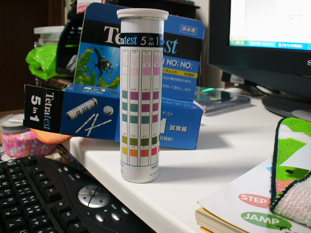 NO3=50が引っ掛る!説明書によると25mg/ℓ以下が理想的との事。50mg/ℓを超えたら水替えを行うと有る、明日ぐらいに4ℓぐらい水替えしようかな。でも数値が合ってるのか、ちょっと試験紙に慣れてこないと微妙だしなぁ。