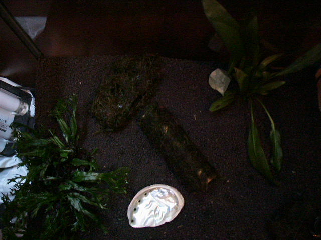 余っていた水草、流木と、どの水槽にも入れている自分で海で捕ってきたアワビの殻と前回のエントリーで巻いたシュリンプハウスを適当にセットし水を入れてみる。