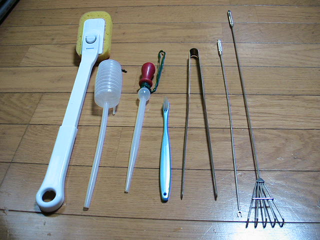 左から100均のトイレ用ブラシ、100均の灯油用スポイト、スポイト小、100均の歯ブラシ、100均のバーベキュウ用ハサミ、エビンガー植え植え、エビンガーハンドとなっております^^