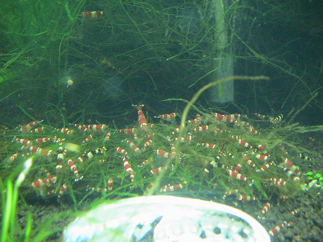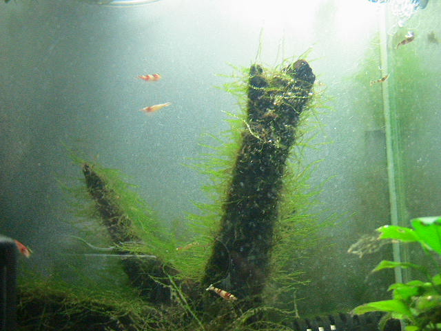 第二水槽はえびが少ないからか、水が出来上がっていないのか、ウィローモスがなかなかうまく育ってくれなく、中が少し溶けたり腐ってたりしていたので、第一水槽の良く育っているのと交換したのですが、その溶け具合が美味しいのか、腐っているモスが美味しいのか判りませんが,入れた瞬間から物凄い勢いで集まってきました。